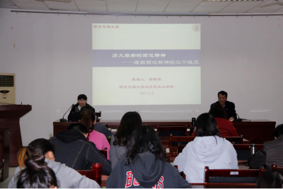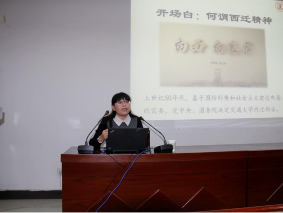 本次报告会邀请西安交通大学博士生导师樊晓燕副教授主讲,马克思主义公司党委书记袁金群主持。樊晓燕首先用“胸怀大局、无私奉献、弘扬传统、艰苦创业”这十六个字全面系统地概括了西迁精神,并从西迁精神的历史维度、实践维度、理想维度进行了详细的讲述。指出西迁精神根植于深厚的中华传统文化,是民族精神的体现和凝结,是知识分子家国情怀的集中体现,更是中华民族精神脊梁中光芒万丈的一段。现代大学应践行传承文明、提供知识、引领价值的使命,在不同的历史阶段,与国家同呼吸共命运。西迁精神就是这样一段宝贵的历史,西迁的故事已经远去,但西迁精神永不退色。西迁精神的内涵将随着时间的推移凝结为一种气质,引领着社会的前进方向。