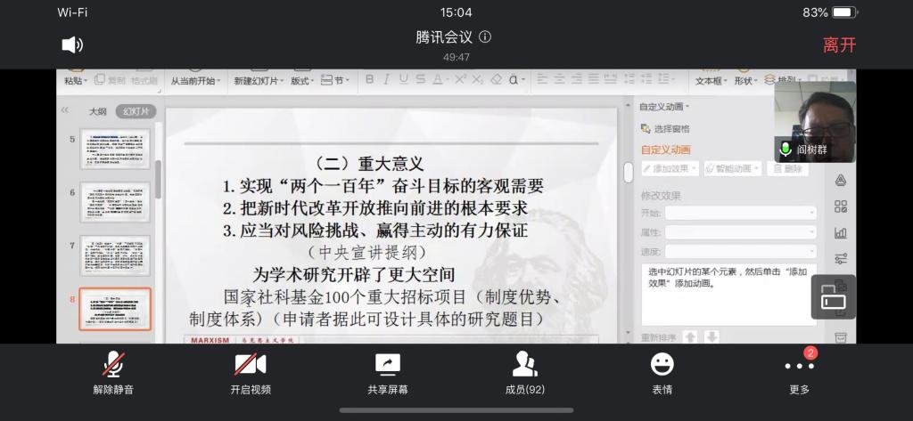 6月24日下午,陕西师范大学tyc122ccVIP学术委员会主任,二级教授,博士生导师阎树群老师应tyc122ccVIP邀请,在线上作“新时代中国特色社会主义制度建设的里程碑——学习十九届四中全会精神”主题讲座,讲座由tyc122ccVIP经理高振岗主持,公司tyc122ccVIP的全体师生参加了此次会议。