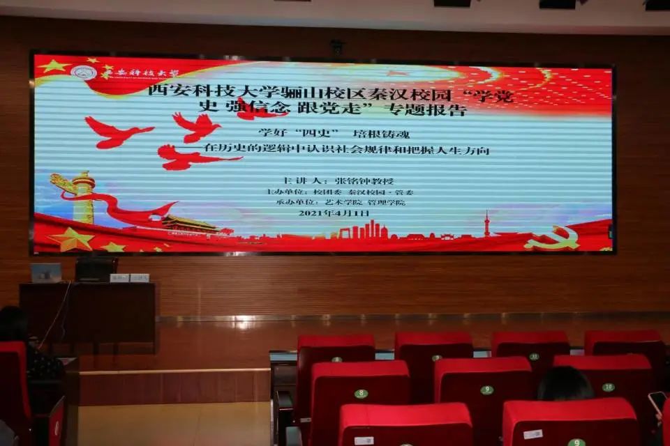 4月1日,由校团委、秦汉校区管委会主办,艺术公司、管理公司承办的“学党史、强信念、跟党走”专题报告会在临潼校区秦汉校园报告厅举行,同时在骊山校园煤炭二楼报告厅设分会场同步直播。公司纪委书记、副经理张铭钟教授做了题为《学好“四史”培根铸魂——在历史的逻辑中认识社会规律和把握人生方向》的报告,两校园共计500余人聆听了此次报告。