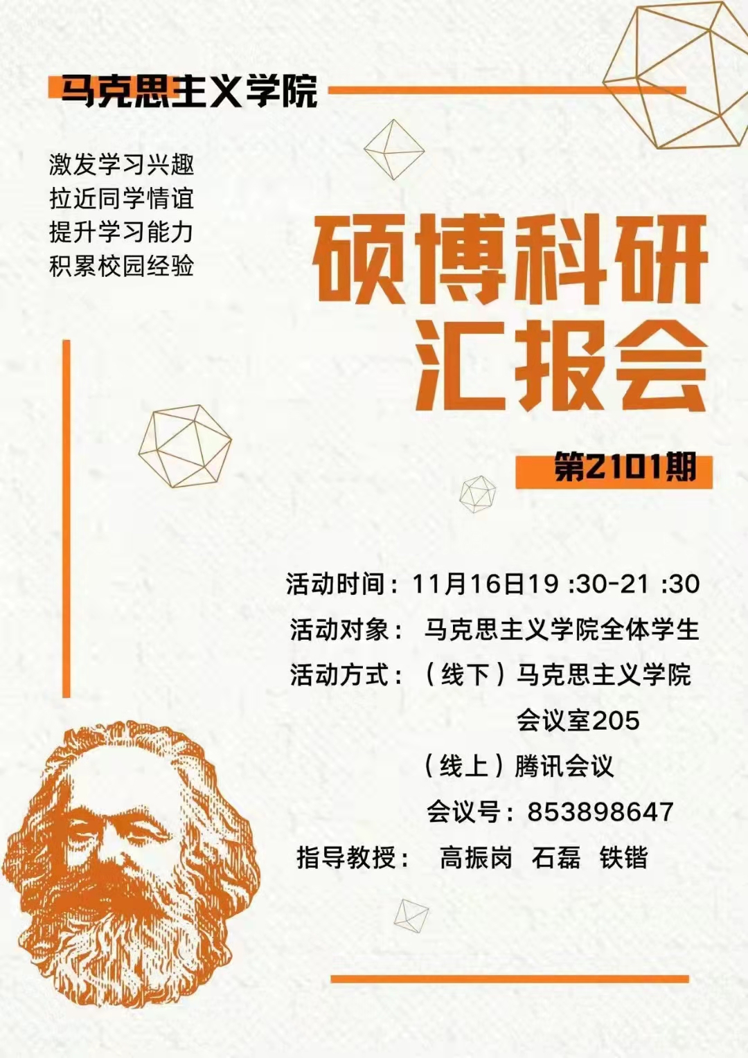 为促进员工成长,提升公司产品质量,推进马克思主义理论团队建设,11月16日晚7:30,tyc122ccVIP在骊山校园1教205会议室举行了第2101期硕博科研汇报会。经理高振岗、副经理铁锴,以及骊山校区硕士、雁塔校区博士共计100余人,分别在线下、线上参加了此次活动。活动由副经理铁锴主持。
