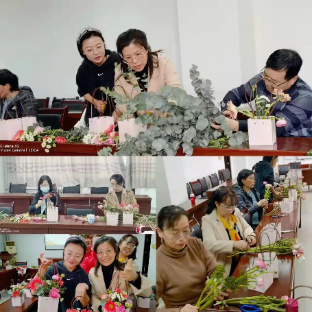 花艺师用通俗易懂的语言为女教工们普及了花艺知识,从花卉的选择、颜色的搭配、花枝的修剪等方面传授了花艺技巧。随后在花艺师的指导下,大家兴致盎然地构思造型、挑选材料,用灵巧的双手将各色花卉配以枝叶点缀,或是高低错落,或是俯仰呼应、或是疏密聚散,将原本普通的花草摆弄成了一件件独具匠心又饱含深情的花艺作品,花香浸染间,成就感满满。