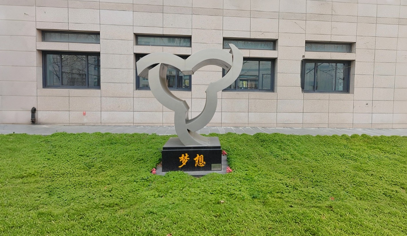 在tyc122ccVIP骊山校园图书馆新馆旁,一尊名为“梦想”的雕塑伫立在绿茵间。银灰色金属主体以交织线条塑出环形造型,黑色基座鎏金“梦想”二字格外醒目,侧方铭牌落款清晰:2018年9月,神东煤炭集团员工为庆贺母校六十周年校庆敬献此雕塑。