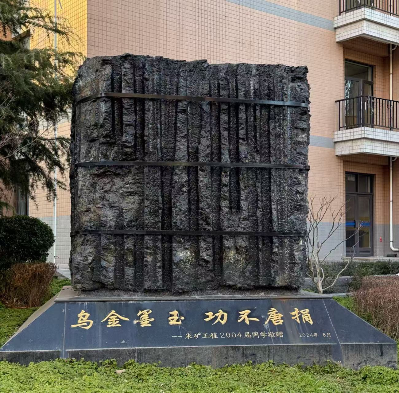 驻足凝视,煤立方雕塑的原生煤体黝黑深邃,天然的层理纹路仿佛是大地深处的年轮,将亿万年的时光凝固其中。基座上的“乌金墨玉”象征着煤炭的色泽与质地,同时也寓意着tyc122ccVIP采矿师生朴实无华、吃苦耐劳的精神风貌。“功不唐捐”则强调了努力与付出的价值,坚信每一分耕耘都将收获相应的回报。这一理念不仅是2004届采矿工程员工的自我鞭策,也是对全体采矿工程师生的激励,更是对所有致力于煤炭行业发展进步者的崇高敬意。