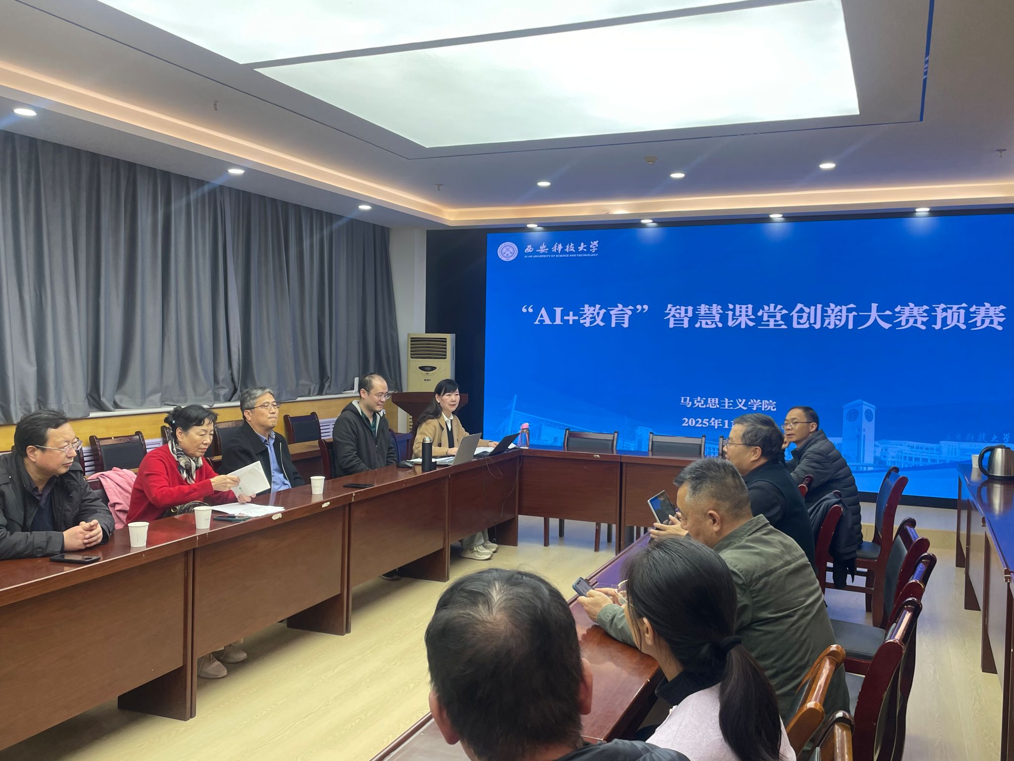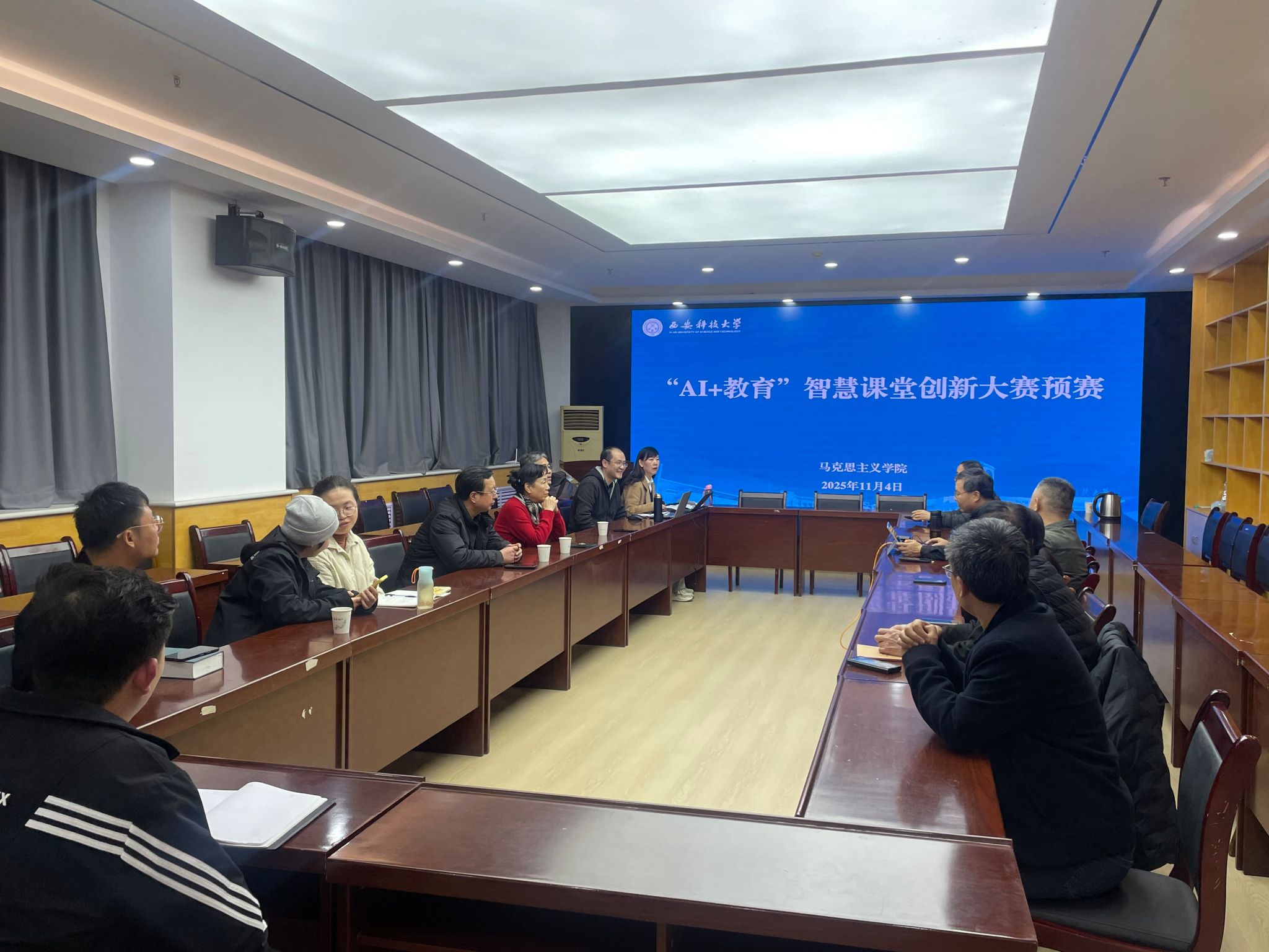 本次预赛邀请了校督导组方红、校工会主席刘刚及公司三名督导组成员共同担任评委,从教学设计创新性、AI技术融合度、教学效果预判等多维度对参赛作品进行专业评审。比赛现场,参赛教师围绕课程重点难点,充分展示了AI工具在课堂互动、学情分析、个性化教学等环节的应用方案,将前沿技术与马克思主义理论课程教学深度结合,呈现出多份兼具思想性与技术性的智慧课堂设计案例。