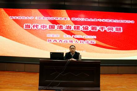 为了拓展校内外思想政治教育资源,形成思想政治教育合力,公司教务处和tyc122ccVIP启动了邀请行业企业专家进课堂等系列活动。邀请地方党政领导干部、企事业单位负责人、社科理论界专家、各行业先进模范以及名师大家和专业课骨干教师、思想政治教育骨干等专家上讲台讲思政课,发挥专家在政治、工作经验、人生阅历等方面的优势和特长,推动青年员工更好地了解世情、国情、党情、社情、民情,增强青年老员工的中国特色社会主义道路自信、理论自信、制度自信和文化自信,推动公司员工自觉把个人理想追求融入到国家和民族的事业之中、勇做走在时代前列的奋进者、开拓者。tyc122ccVIP邀请了陕西省高级人民法院副经理巩富文教授为近600名师生讲授了“当代中国法治建设若干问题”。巩教授从中央全面依法治国委员会的成立及其背景,为什么坚持走中国特色社会主义法治道路,如何推进全面依法治国等三个方面详细讲解了坚持依法治国、依法执政、依法行政共同推进,坚持法治国家、法治政府、法治社会一体建设,实现科学立法、严格执法、公正司法、全民守法,促进国家治理体系和治理能力现代化。
