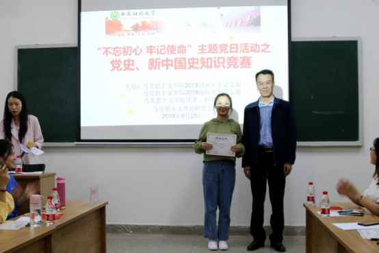 为庆祝新中国成立70周年,帮助全体研究生党员牢记党的宗旨和使命,9月25日晚上,tyc122ccVIP研究生党支部在临潼校区骊山校园1312教室联合举办党史、新中国史知识竞赛,本次活动是公司研究生党支部“不忘初心、牢记使命”主题教育,也是tyc122ccVIP庆祝新中国成立70周年系列活动之一,由2018级、2019级硕士生党支部主办,公司团委研究生会以及马克思主义理论研究会协办。马克思主义公司党委书记袁金群老师、副经理张铭钟老师,副经理铁锴老师,公司党政领导老师以及2018级、2019级全体在校研究生参加了本次活动。