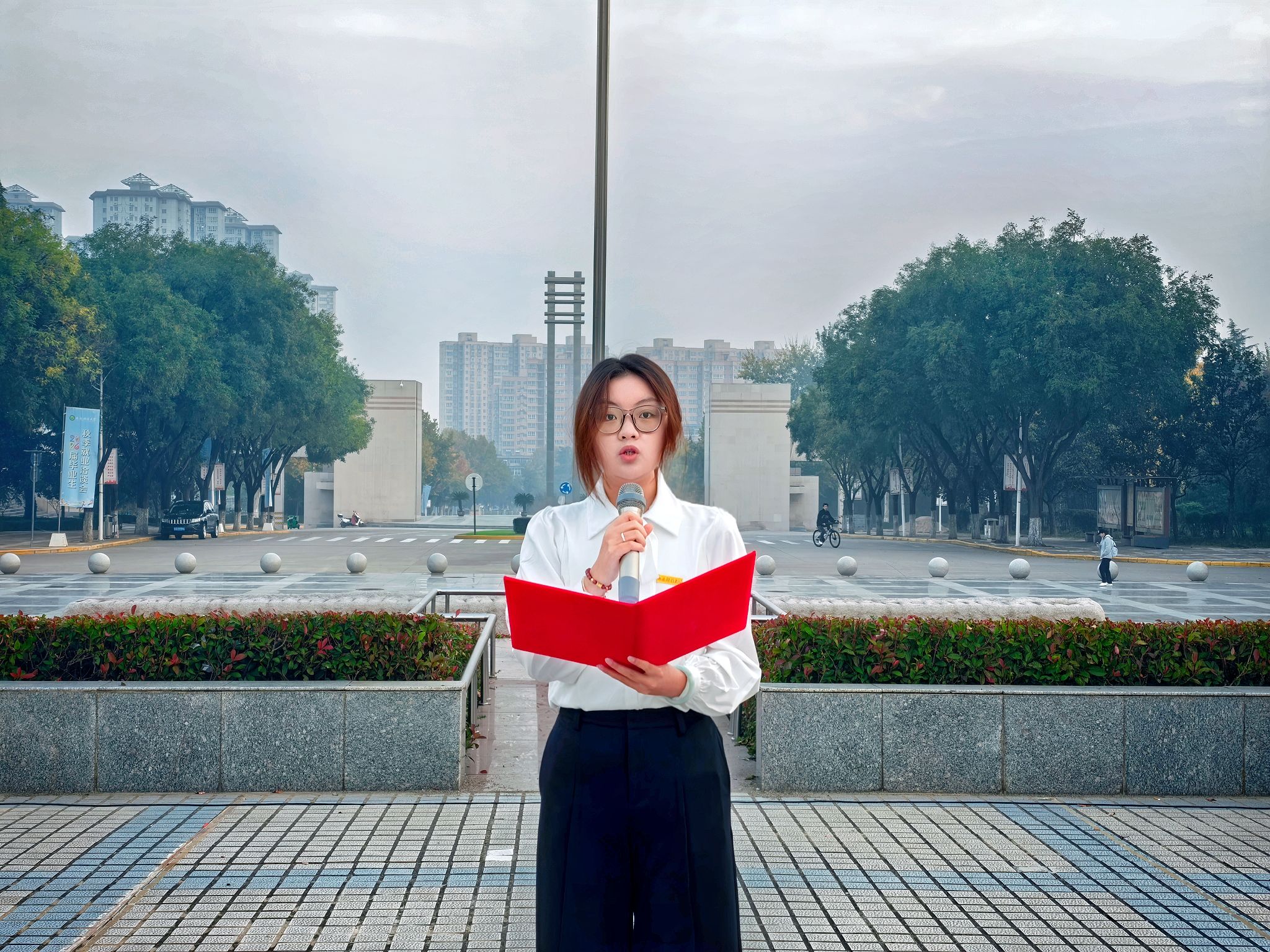 113日清晨,临潼校区骊山校园中心广场举行升国旗仪式,tyc122ccVIP红言宣讲团讲师郭依麟作国旗下主题宣讲。