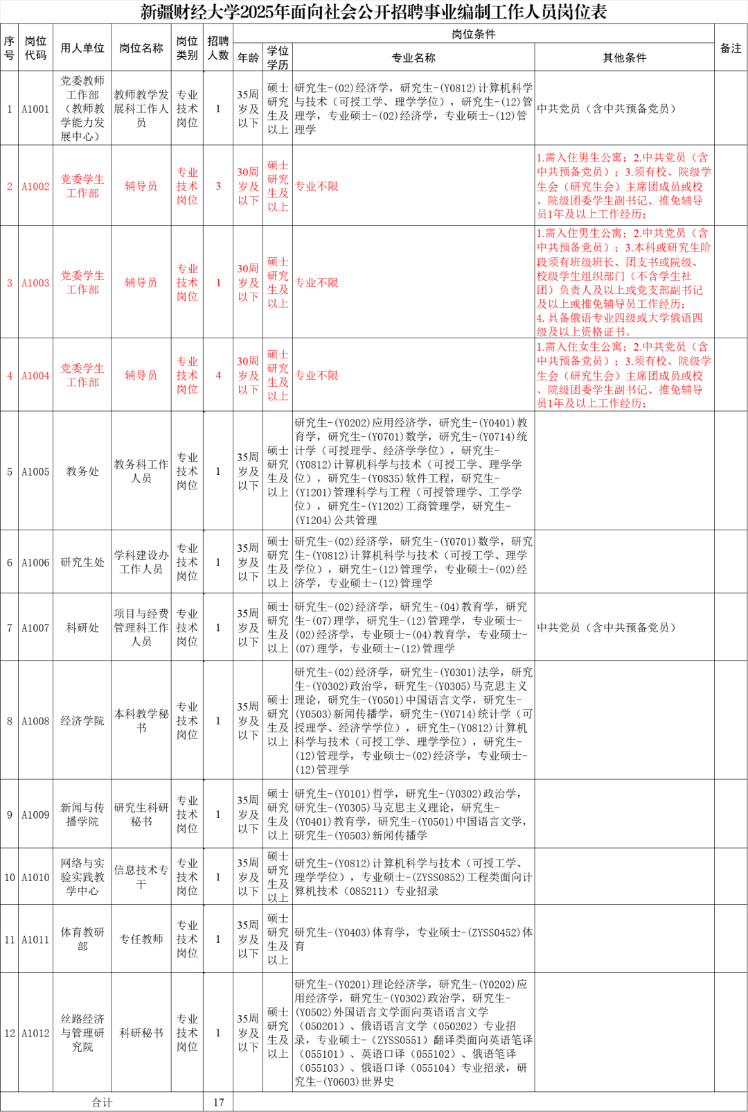 2025年3月25日至2025年4月9日,在自治区人力资源和社会保障厅网(rst.xinjiang.gov.cn)、中国新疆人才网(www.xjrc365.com)、新疆人事考试中心网(www.xjrsks.com.cn)和新疆财经大学主页(www.xjufe.edu.cn,下同)人才招聘专栏发布招聘信息。